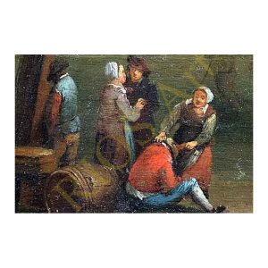 Oil on wood, "The Villagers on Open Air Celebration" is a masterful depiction of XVII century rural life by the renowned artist David Teniers junior. Painted with exquisite detail, this scene captures the joy and mirth of village celebrations. On the reverse, the painting bears the date 1653 in pencil, accompanied by an inscription that remains unreadable. This work of art measures 20.2 x 33.5, reflecting the artistic vision of the period, and would be an impressive addition to any collection.