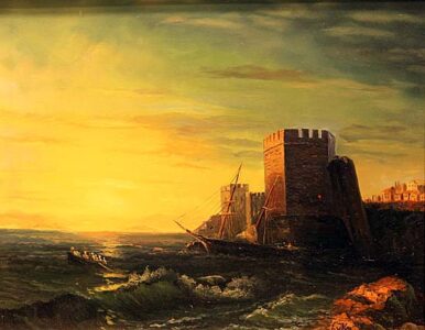 Experience the breathtaking panorama of the "Lukaš. Fortress on the Coast (second half of the 19th century)" artwork. Painted meticulously on wood, the masterpiece captures the essence of the coastal fortress with its vivid details and vibrant colors. The artist's signature, "Lukaš", adorns the lower right corner, testament to its authenticity and craftsmanship.